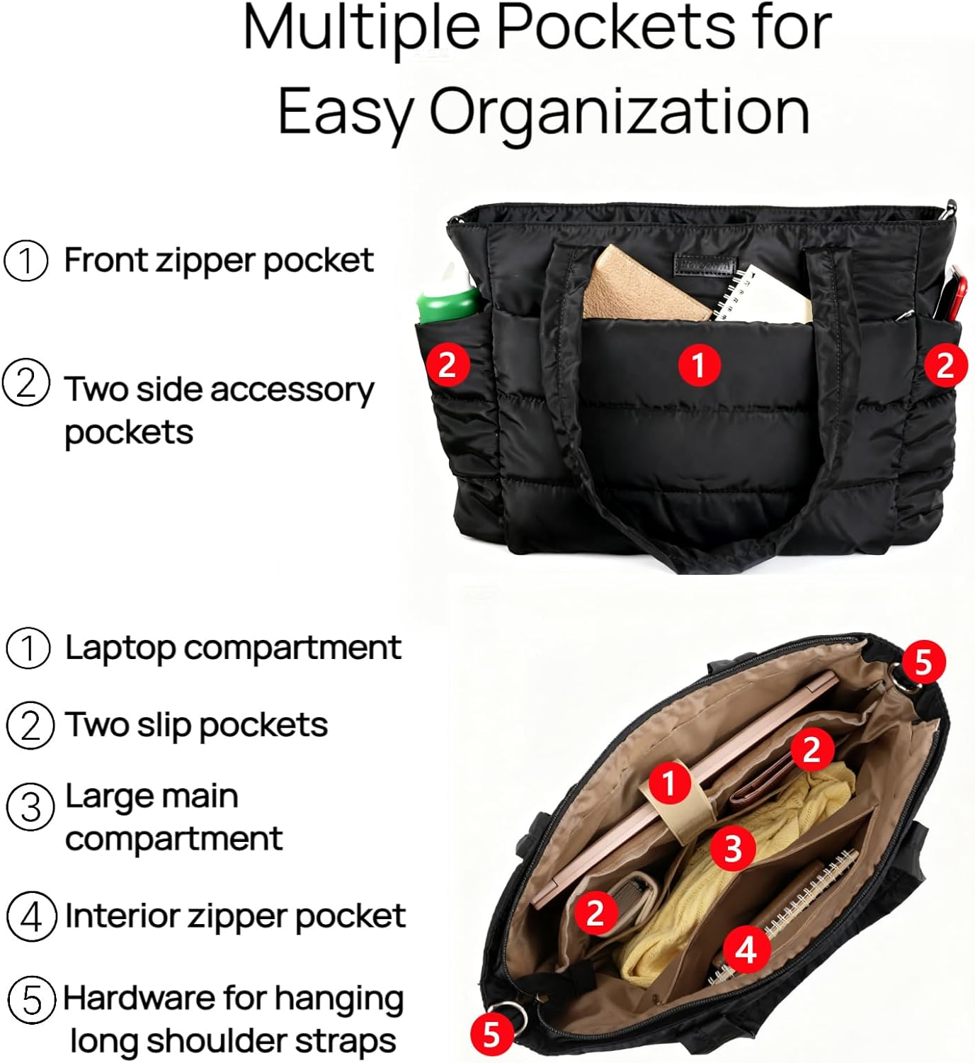 Barabum Tote Bag for Women with Long Strap, Lightweight Puffy Tote Bag with Compartments Quilted Shoulder Bag Handbag